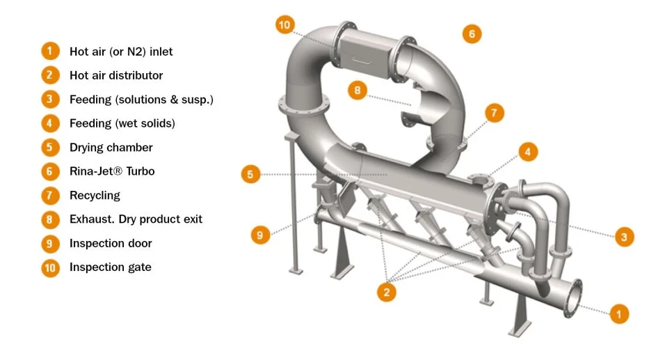 Rina 플래시 드라이어는 트로이달 또는 직선형 건조 챔버에서 슬러리를 분무하거나 습식 시료를 주입하는 방식으로 작동합니다. 짧은 시간의 액체 증발을 위해 고온으로 건조할 수 있는 제품에 권장됩니다.