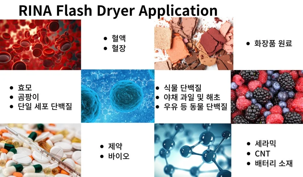 플래시 드라이어는 빠른 속도로 흐르는 고온의 기체, 즉 열기류를 이용해 습기있는 입자를 건조하는 장비입니다. 수분이 함류된 케이크 상태거나 페이스트 진흙형태거나 슬러리 상태의 시료를 건조기내의 열풍발생장치에 의해 가열된 고온의 기체의 흐름 속에 확산 시켜 시료를 급속도로 건조합니다. 이러한 일련의 과정을 통해 고품질의 미세 분말을 얻을 수 있습니다.