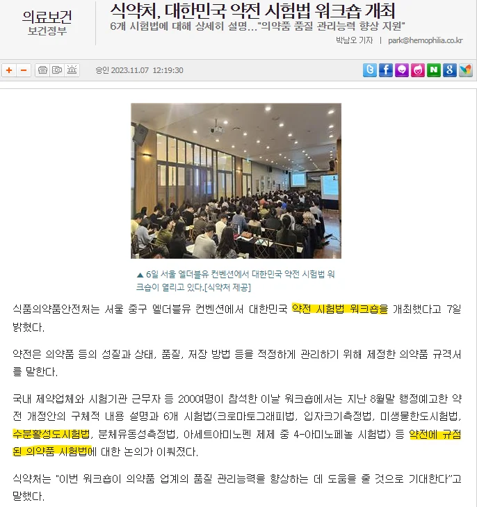 대한민국 약전 시험법 개정 및 추가식품의약품안전처는 지난 8월 30일 행정예고를 통해 약전의 일부 개정을 예고했습니다. 내용은 기준과 규격에 미흡한 의약품목 삭제와 크로마토그래피법, 입자크기측정법, 미생물한도시험법, 수분활성도시험법, 분체유동성측정법, 4-아미노페놀 시험법 등을 포함한 새로운 시험법에 관한 규정이 삽입되었습니다. 식약처에서는 이에 대비해 새로운 시험법의 워크숍을 개최하는 등 다양한 홍보 및 노력을 기울이고 있습니다.