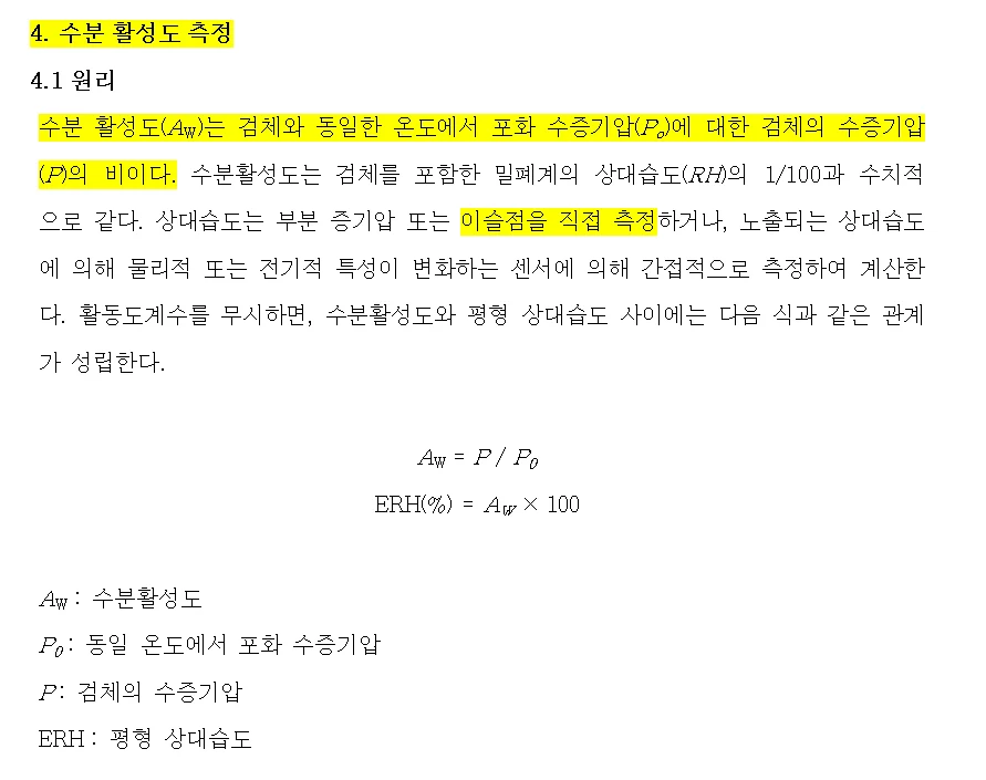 약전에서는 수분활성도 측정방법을 이슬점측정법(Dew Point)으로 명시하고 있고, 그 외의 상세한 요구조건에 관해서도 나열하고 있습니다.