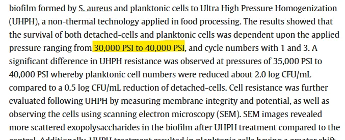 식품 제조 현장의 골칫거리인 바이오필름(Biofilm) 제어에도 UHPH는 뛰어난 성능을 보입니다. 설비 표면에 형성된 생물막에서 떨어져 나온 황색포도상구균(Staphylococcus aureus) 등 병원성 세균은 일반적인 세척으로 제거가 어렵습니다.